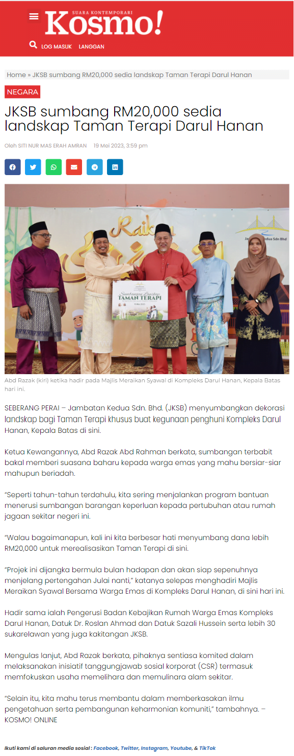 Jambatan Kedua Admin Kosmo! Related postsCSR Kenderaan Elektrik20 Oct 23JKSB Blood Donation 2021-20221 Aug 22Dua lorong manual RFID dibuka di Plaza Tol Bandar Cassia1 Dec 23 Previous postNotis Penutupan Jalan | 16 -17 Mei 2023Next postJKSB sumbang RM20,000 sedia landskap di Kompleks Darul Hanan