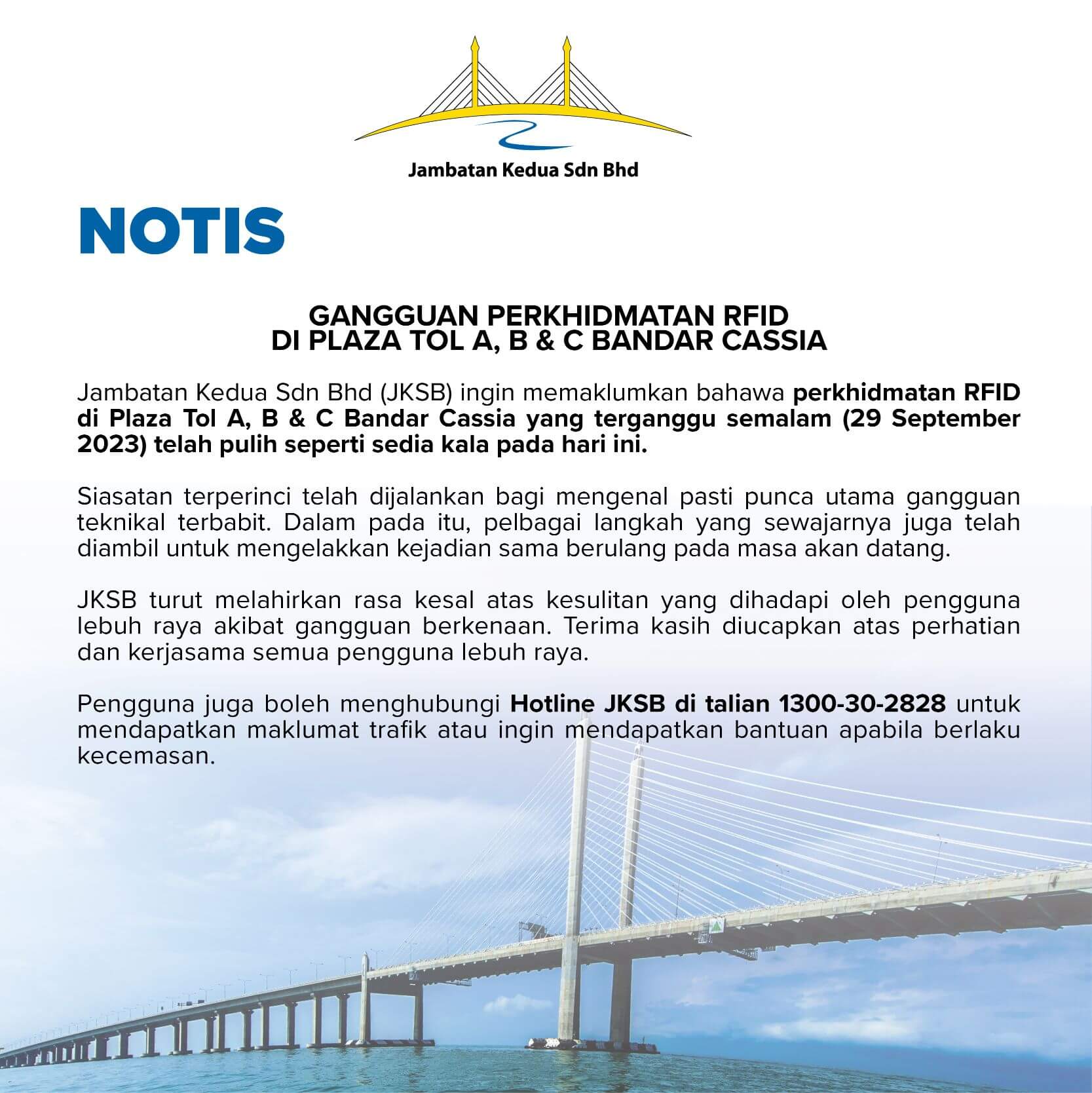Notis Gangguan Perkhidmatan Rfid Di Plaza Tol A, B & C Bandar Cassia | 30 September 2023