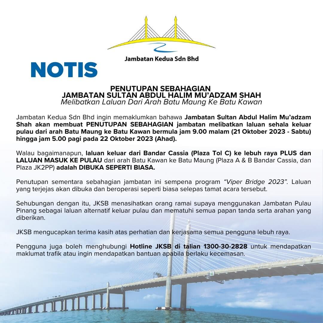 Penutupan Sebahagian Jambatan Sultan Abdul Halim Mu’adzam Shah Melibatkan Laluan Dari Arah Batu Maung Ke Batu Kawan