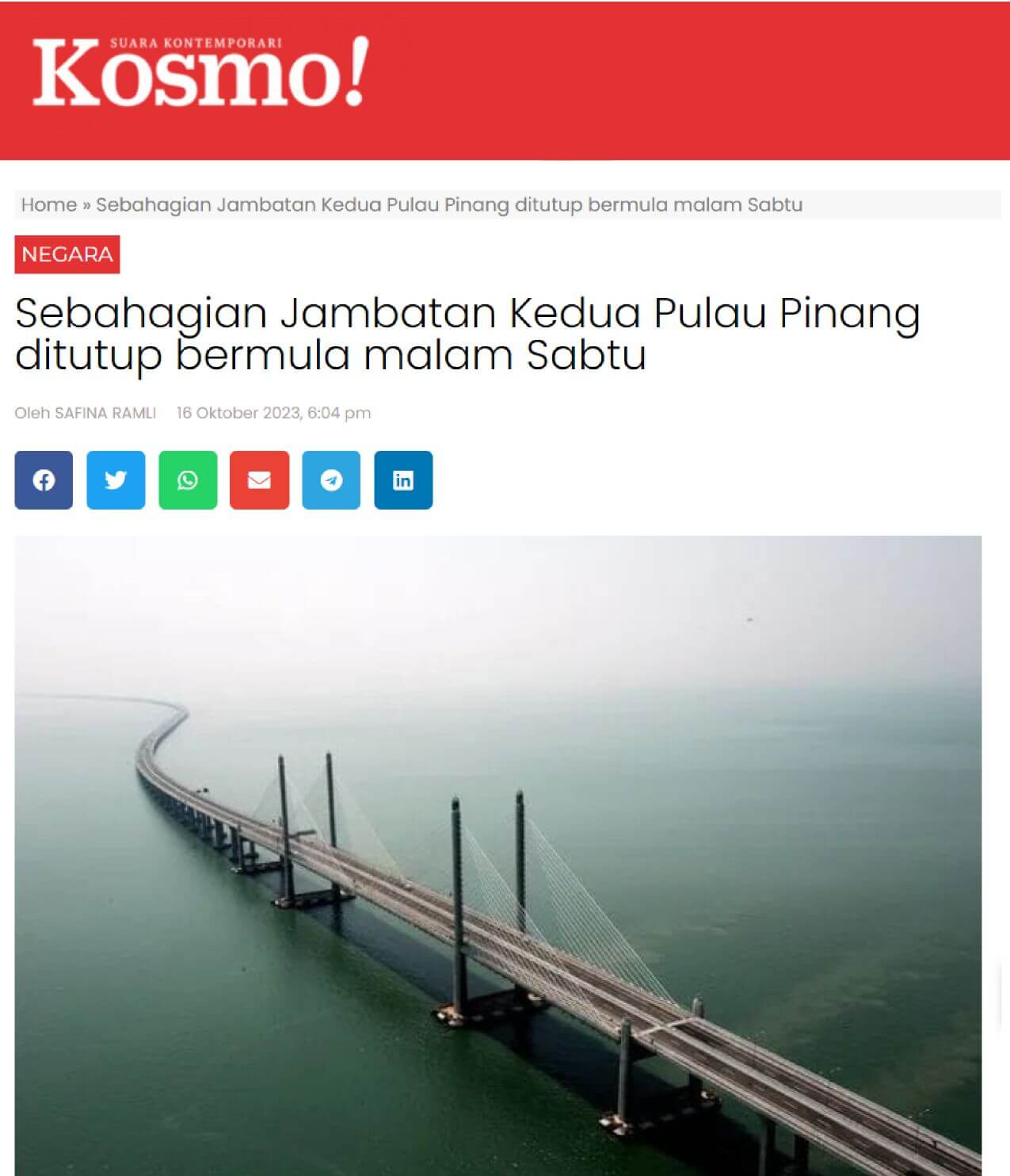 Sebahagian Jambatan Kedua Pulau Pinang ditutup 16 September