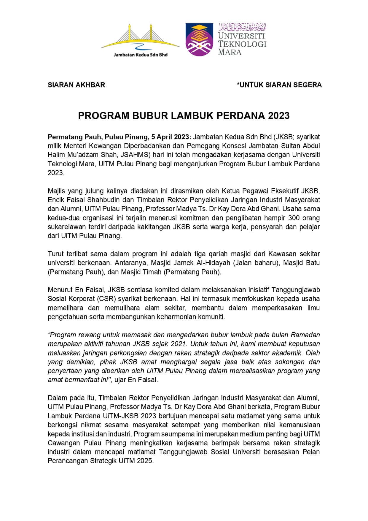 Download PDF Jambatan Kedua Admin Related postsPress Release | Program Bubur Lambuk Perdana5 Apr 23JKSB Blood Donation 2021-20221 Aug 22Press Release | Program Korban Perdana 202330 Jun 23 Previous postNOTIS PEMAKLUMAN PENUTUPAN DAN LENCONGAN – 14 & 15 OGOS 2024Next postNOTIS PENJELASAN BERHUBUNG DAKWAAN KEJADIAN JALAN MENDAP DI JSAHMS