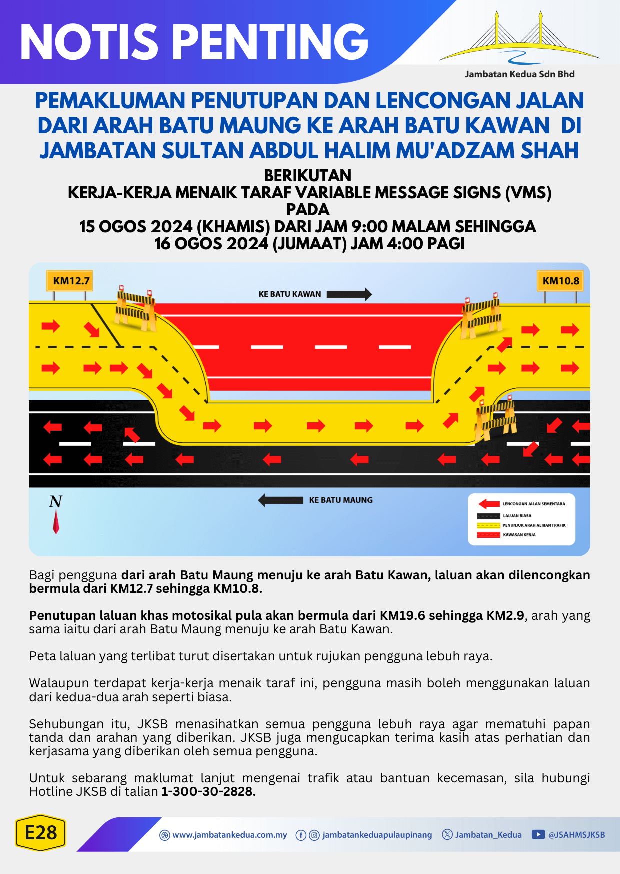 Jambatan Kedua Admin Related postsMajlis Rumah Terbuka JKSB 202423 Apr 24Penang 2nd Bridge Loyalty Program – Pemenang Pusingan Kedua (10 Oktober – 9 Disember 2023)23 Jan 242 Lorong Manual RFID Dibuka Kurangkan Kesesakan Trafik Waktu Puncak1 Dec 23 Previous postTYT Penang Fellowship RideNext postNOTIS KENYATAAN SEBUT HARGA ASET ALIH