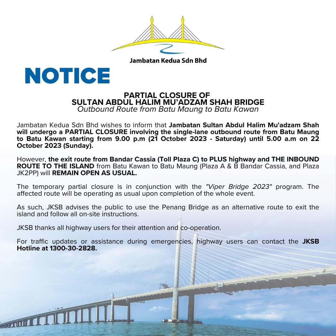 Jambatan Kedua Admin Related postsPenutupan Sementara Jambatan Sultan Abdul Halim Mu’adzam Shah21 Dec 23JKSB sumbang RM20,000 sedia landskap di Kompleks Darul Hanan19 May 23Dua lorong manual RFID dibuka di Plaza Tol Bandar Cassia1 Dec 23 Previous postSebahagian Jambatan Kedua Pulau Pinang bermula malam SabtuNext postCSR Kenderaan Elektrik