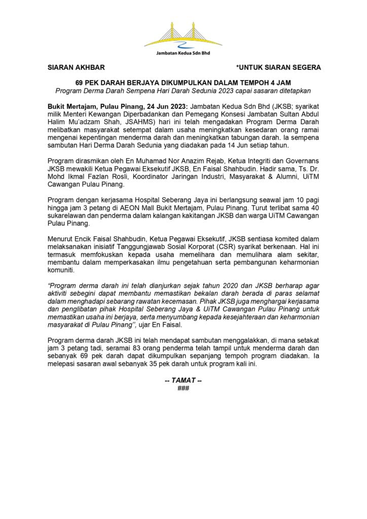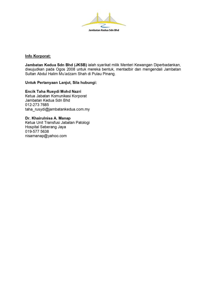 Jambatan Kedua Admin Related postsPenang 2nd Bridge Loyalty Program7 Aug 23JKSB rai 50 anak yatim dengan persiapan Aidilfitri4 Apr 23NOTIS PEMAKLUMAN PENUTUPAN DAN LENCONGAN – 14 & 15 OGOS 202413 Aug 24 Previous postPolis bantuan maut dirempuh lori ketika bantu kereta rosakNext postPress Release | Program Korban Perdana 2023