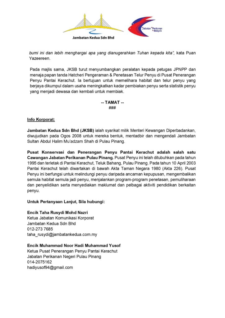 Jambatan Kedua Admin Related postsProgram Konservasi Penyu Inisiatif Jabatan Perikanan PP, JKSB8 Feb 23Majlis Penyampaian Hadiah Kepada Pemenang Kempen Penang 2nd Bridge Loyalty Program (Pusingan 1)8 Nov 23NOTIS PENJELASAN BERHUBUNG DAKWAAN KEJADIAN JALAN MENDAP DI JSAHMS6 Jun 25 Previous postJKSB Blood Donation 2021-2022Next postJKSB, Jabatan Perikanan pupuk semangat pulihara habitat penyu