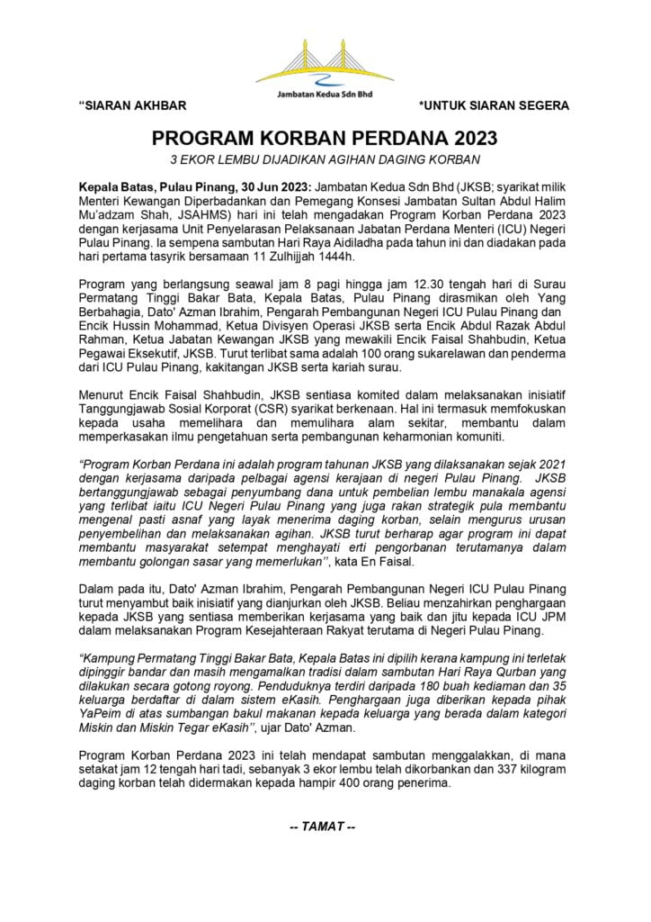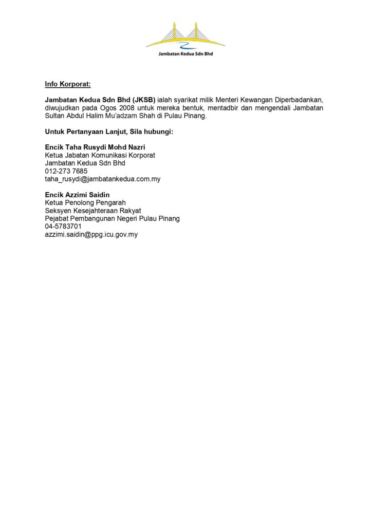 Jambatan Kedua Admin Related postsNOTIS KENYATAAN SEBUT HARGA ASET ALIH9 May 25Program Jelajah Ramadan Rtm Pulau Pinang Aktiviti Kemuncak Di Masjid Abdullah Fahim15 Apr 23Sebahagian Jambatan Kedua Pulau Pinang bermula malam Sabtu16 Oct 23 Previous postPress Release | 69 Pek Darah Berjaya Dikumpulkan Dalam Tempoh 4 JamNext postThe Second Penang Bridge Project