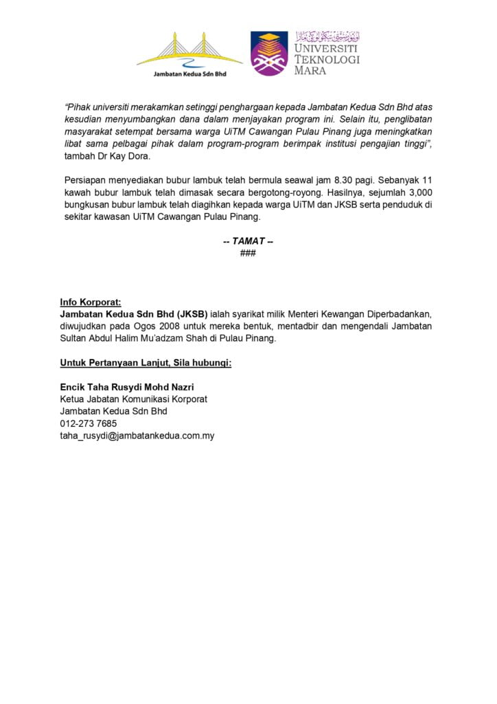 Jambatan Kedua Admin Related postsNOTIS TIADA PENUTUPAN LALUAN MELIBATKAN JSAHMS SEMPENA ACARA “PANTAI MARATHON 2025”20 Jun 25Penutupan Sebahagian Jambatan Sultan Abdul Halim Mu’adzam Shah Melibatkan Laluan Dari Arah Batu Maung Ke Batu Kawan16 Oct 232 Hari Tol Percuma Sempena Hari Natal!22 Dec 23 Previous postJKSB rai 50 anak yatim dengan persiapan AidilfitriNext postLawatan Seri Paduka Baginda Yang Di-Pertuan Agong ke JSAHMS